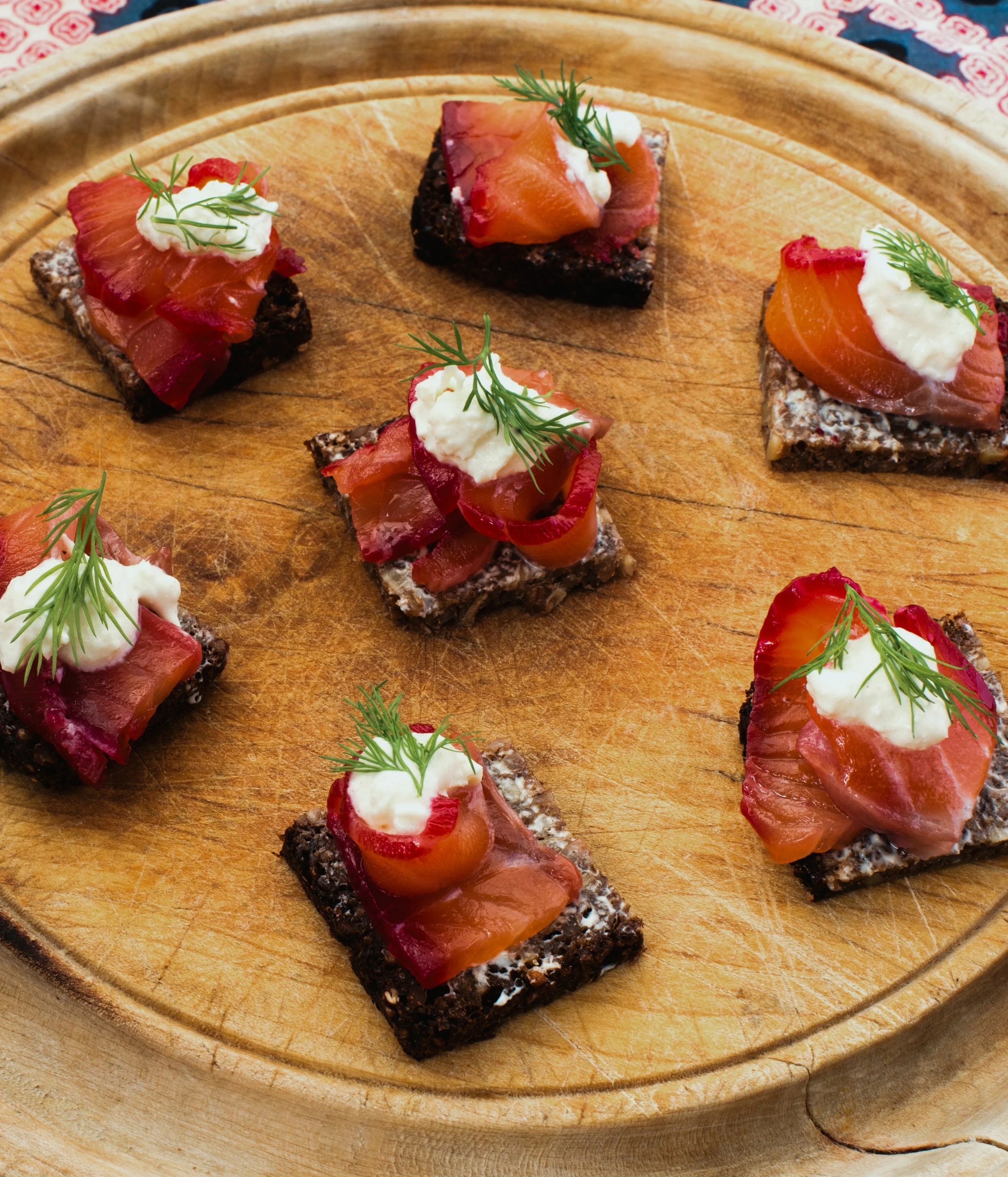 Gin and juniper cured salmon with apple and fennel cream on pumpernickel bread.